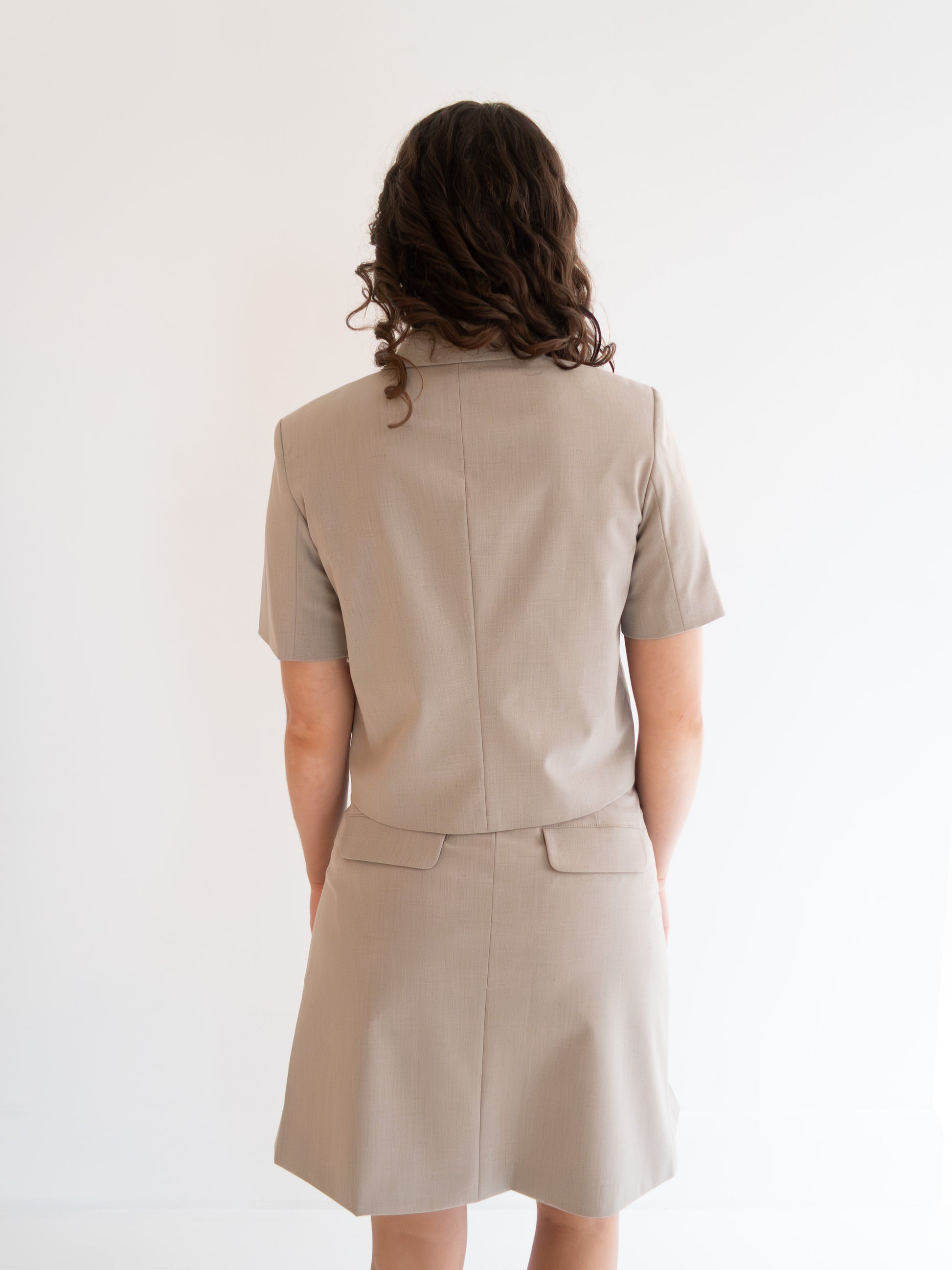 A short-sleeved jacket in sharp Taupe suit fabric. Slightly boxy fit, designed to graze the hip. Fully lined in silky viscose with tortoiseshell buttons down the front and a notched lapel. Pair with the Jeannie Skirt for a uniform look.