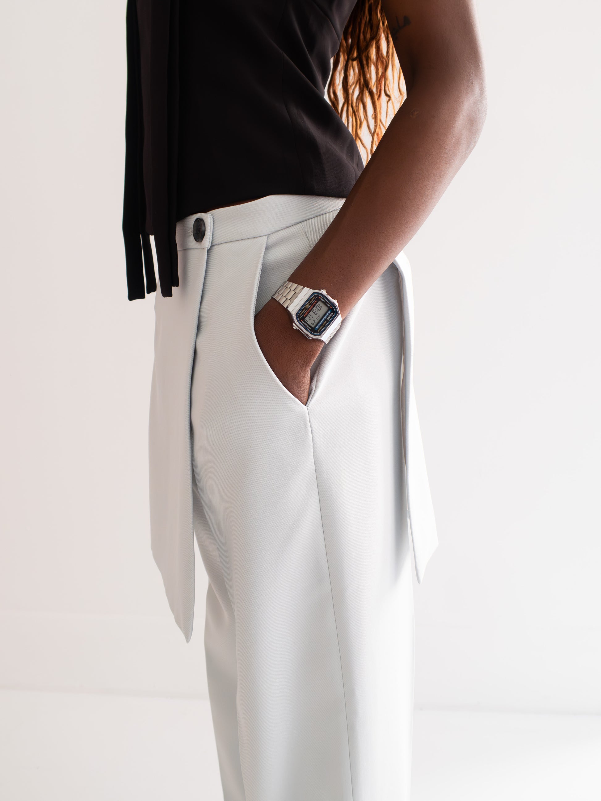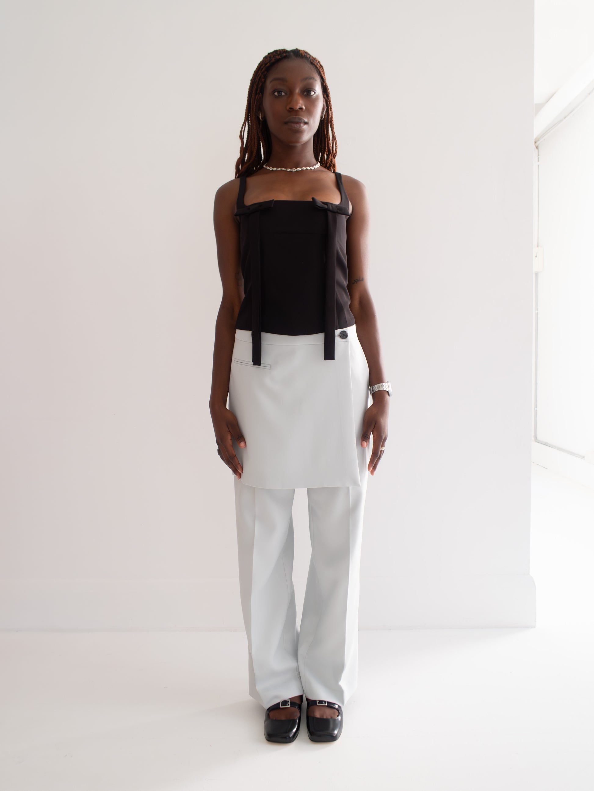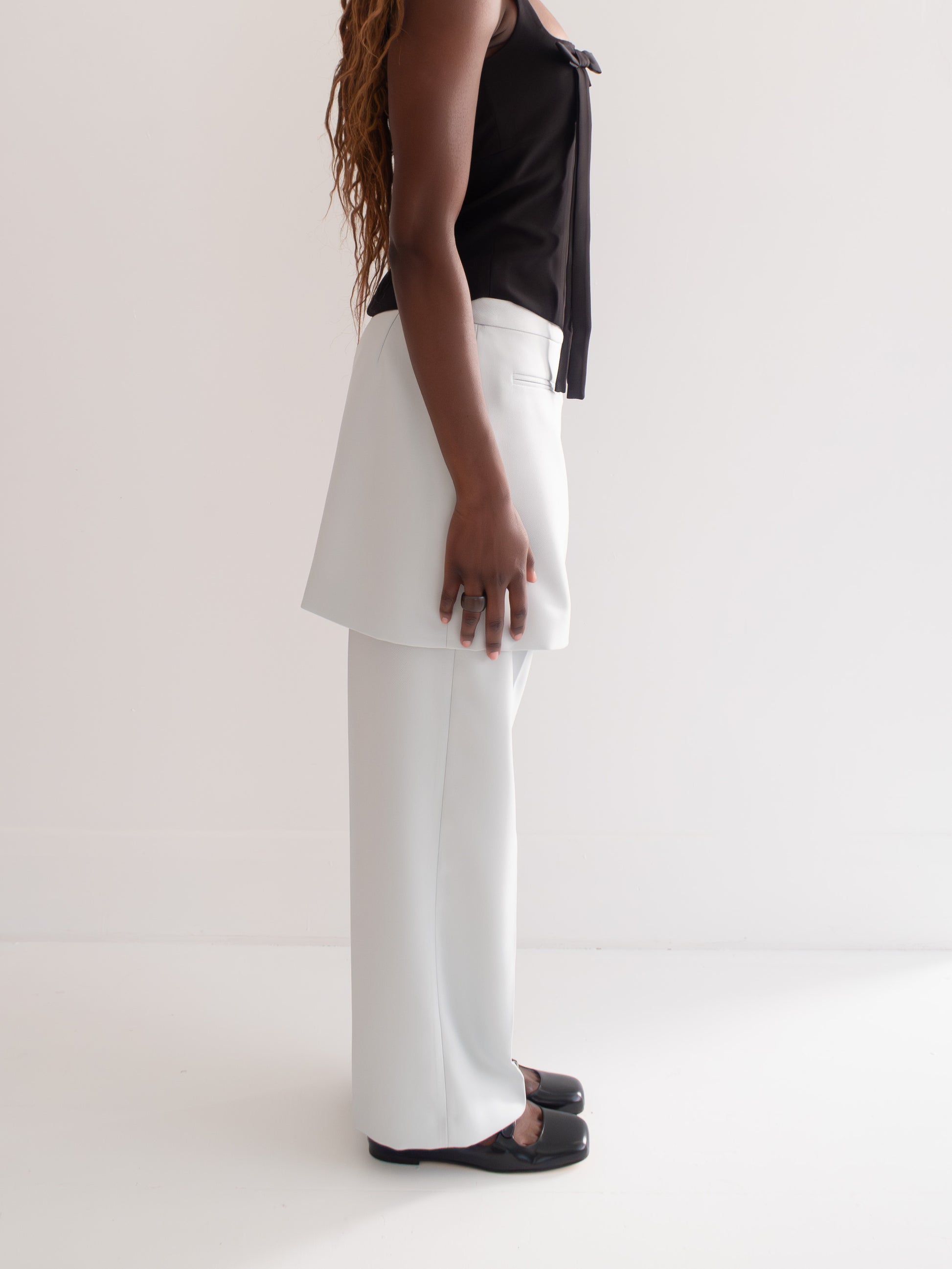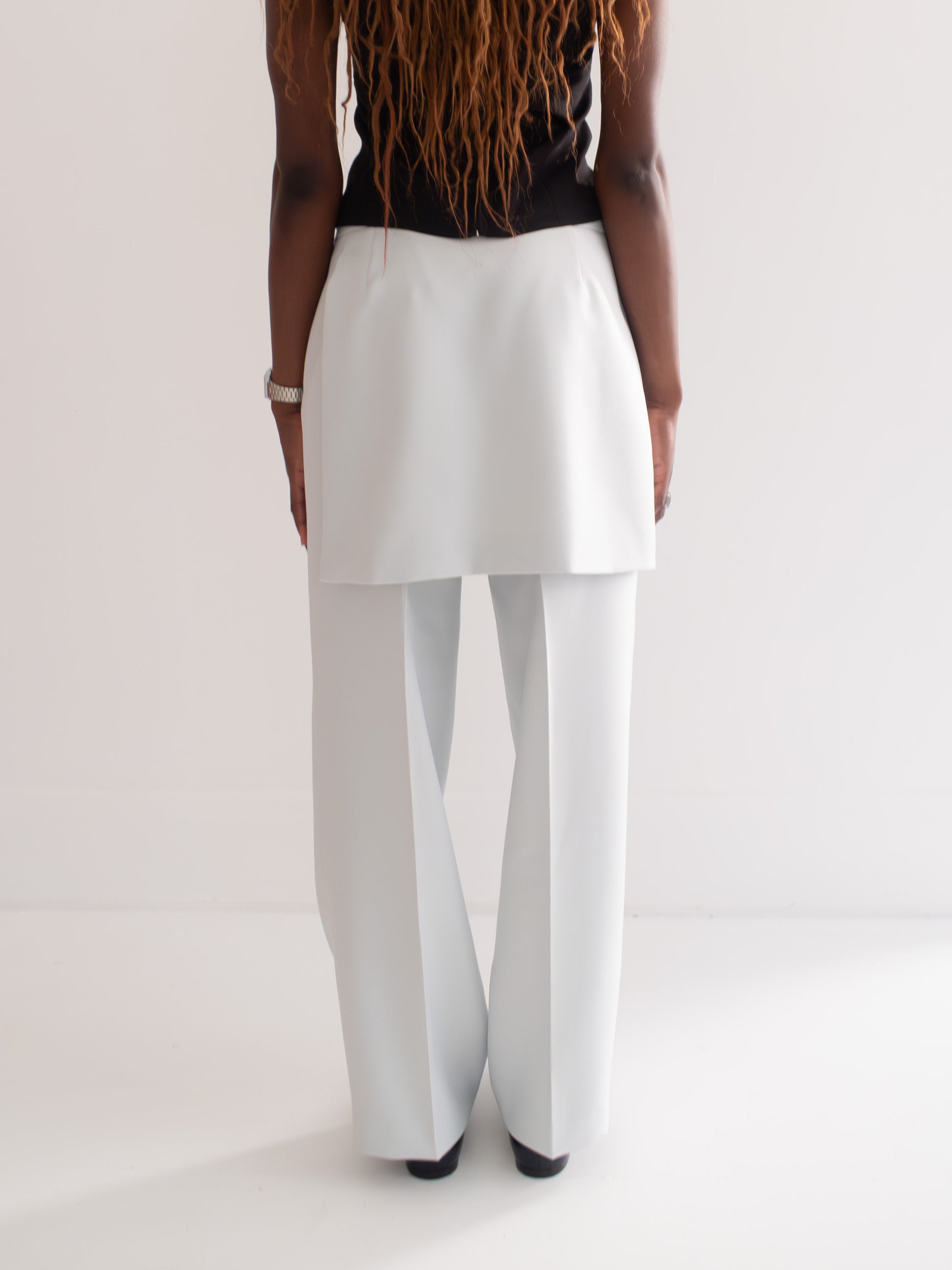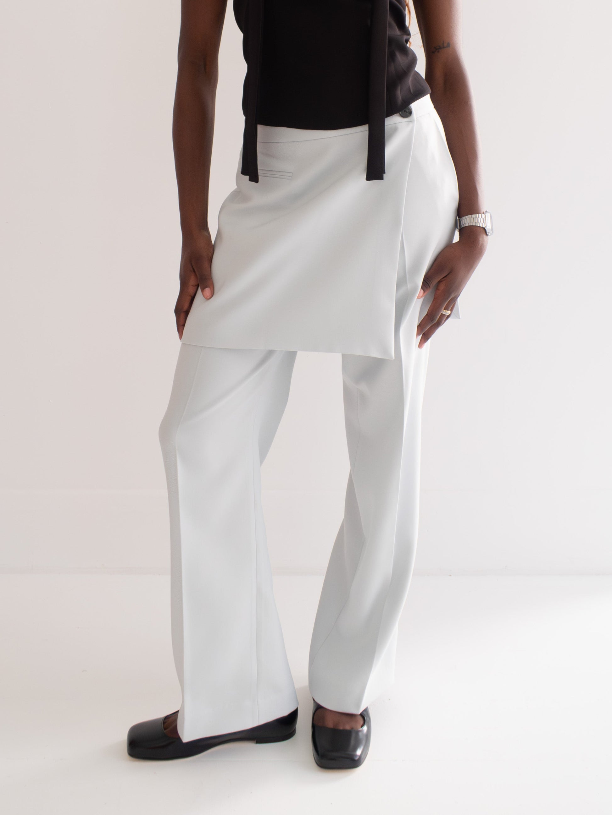 Low-rise pants in ice blue suiting fabric. Designed with an integrated apron skirt overlay that reveals the pant pockets on one side. Finished with a button closure, zip fly, and a charming welt pocket on the skirt for added detail.