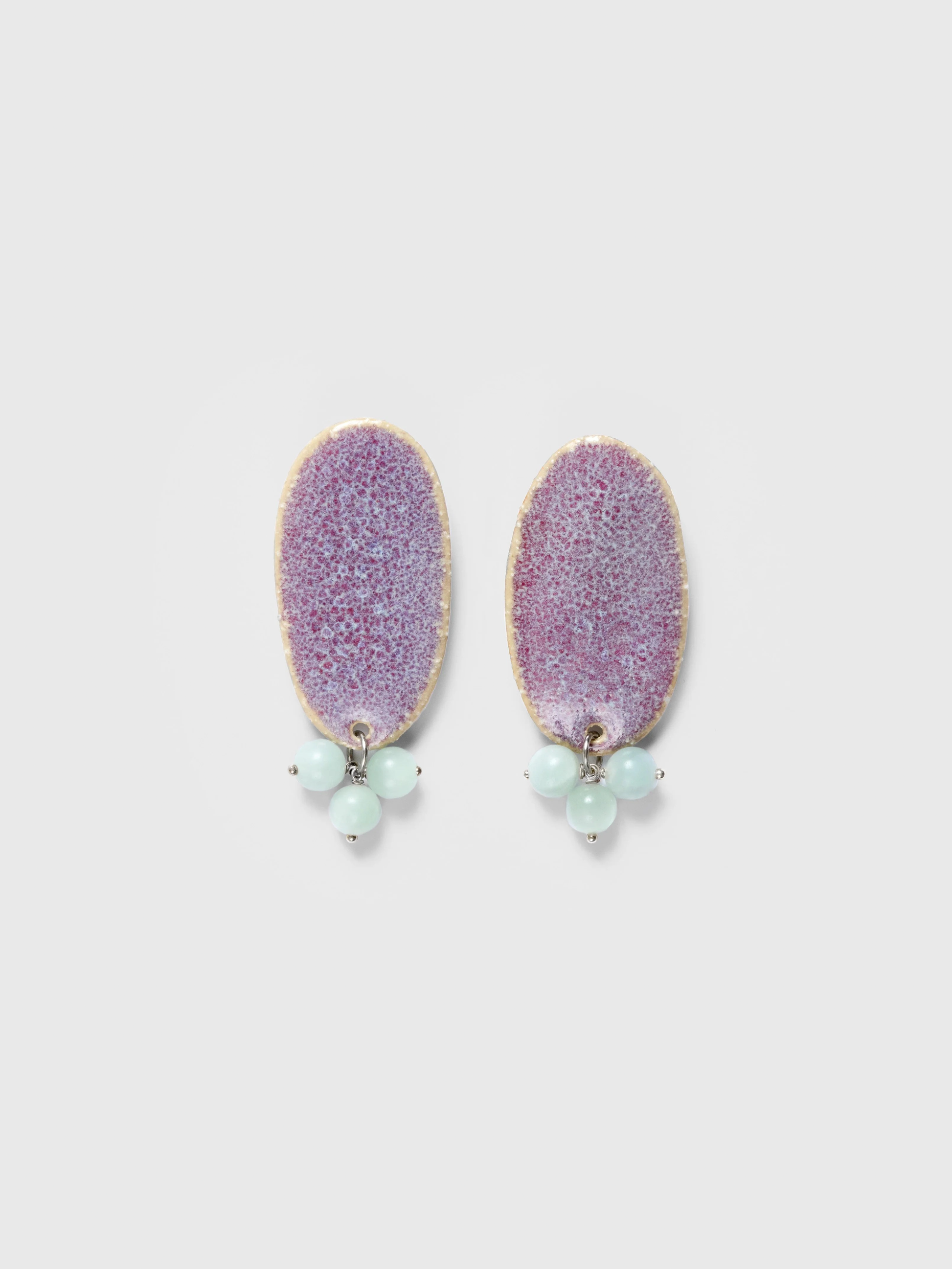 A pair of hand-formed stoneware ovals glazed in soft purples, and a trio of aventurine stones dangling below. These earrings have 925 silver stud posts.