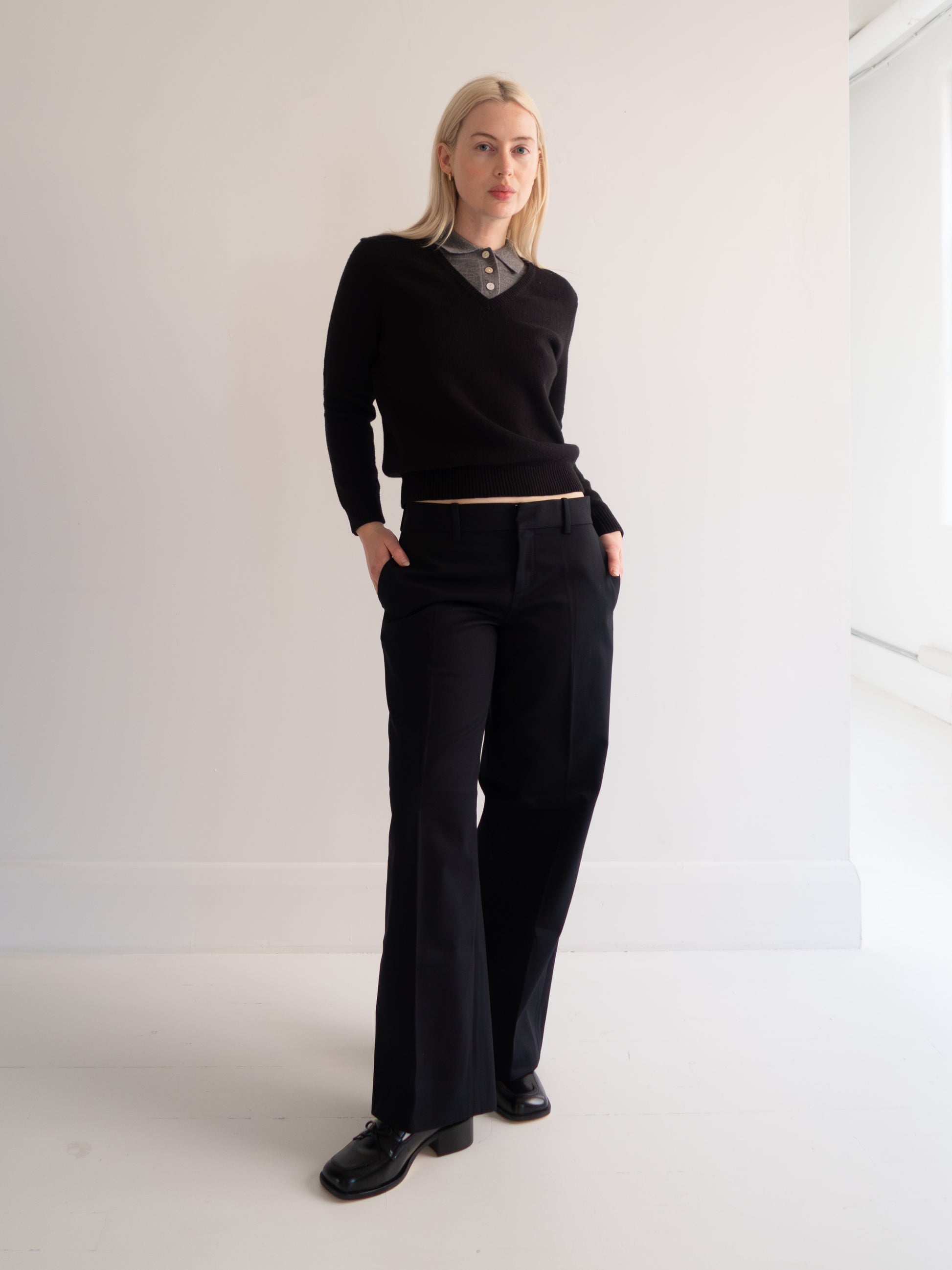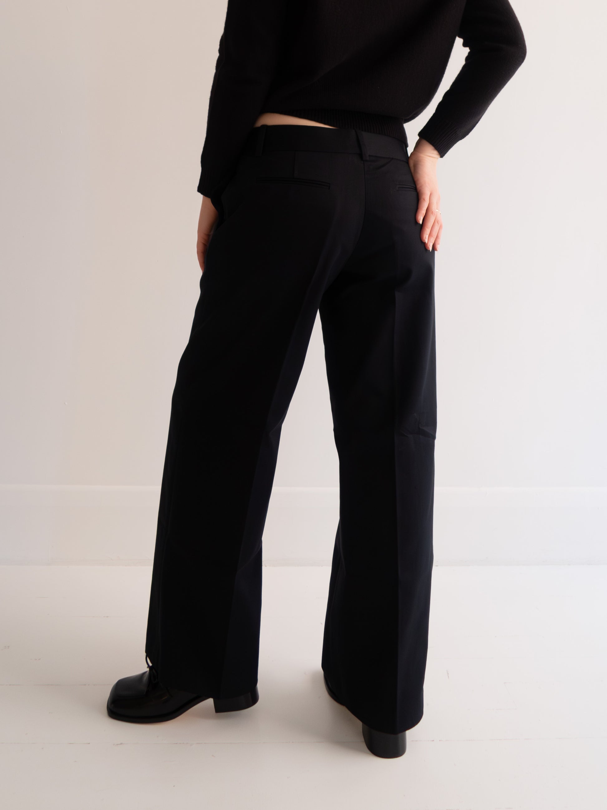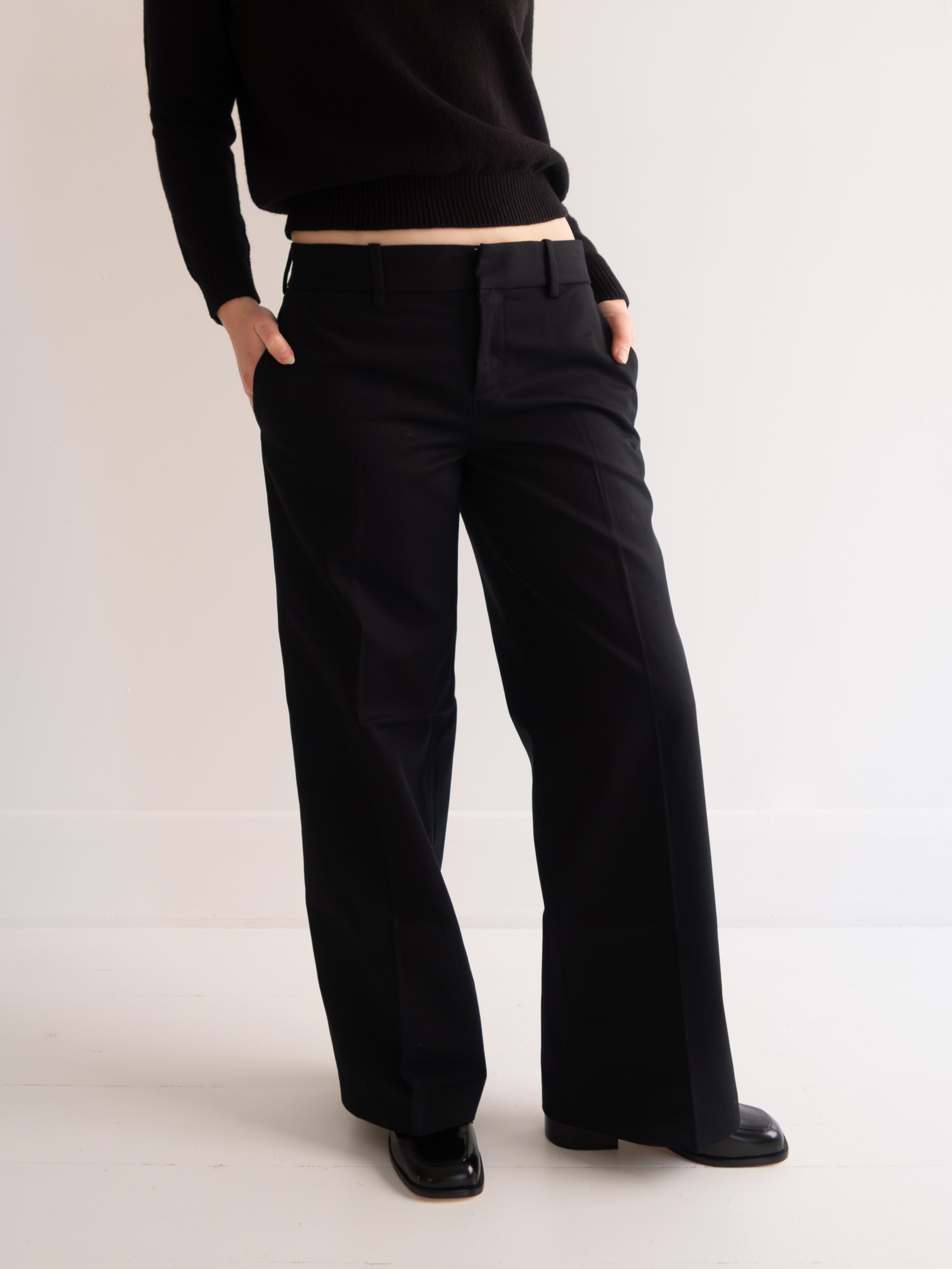 Menswear-inspired cotton chino trousers. Sitting low at the waist, they have a straight cut wide leg, belt loops and side pockets.