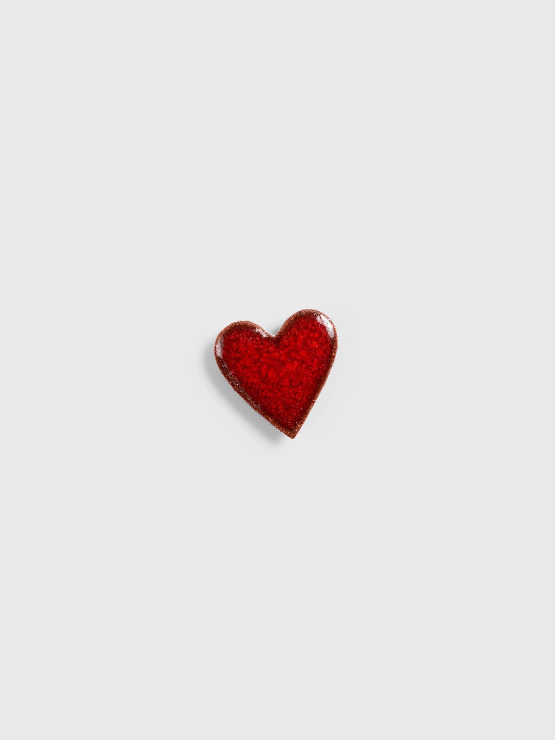 A ceramic heart with a rich, red speckled glaze. Shaped by hand and finished with a sleek brooch pin, ready to be worn wherever your heart desires. Choose from Mini or Regular in size.