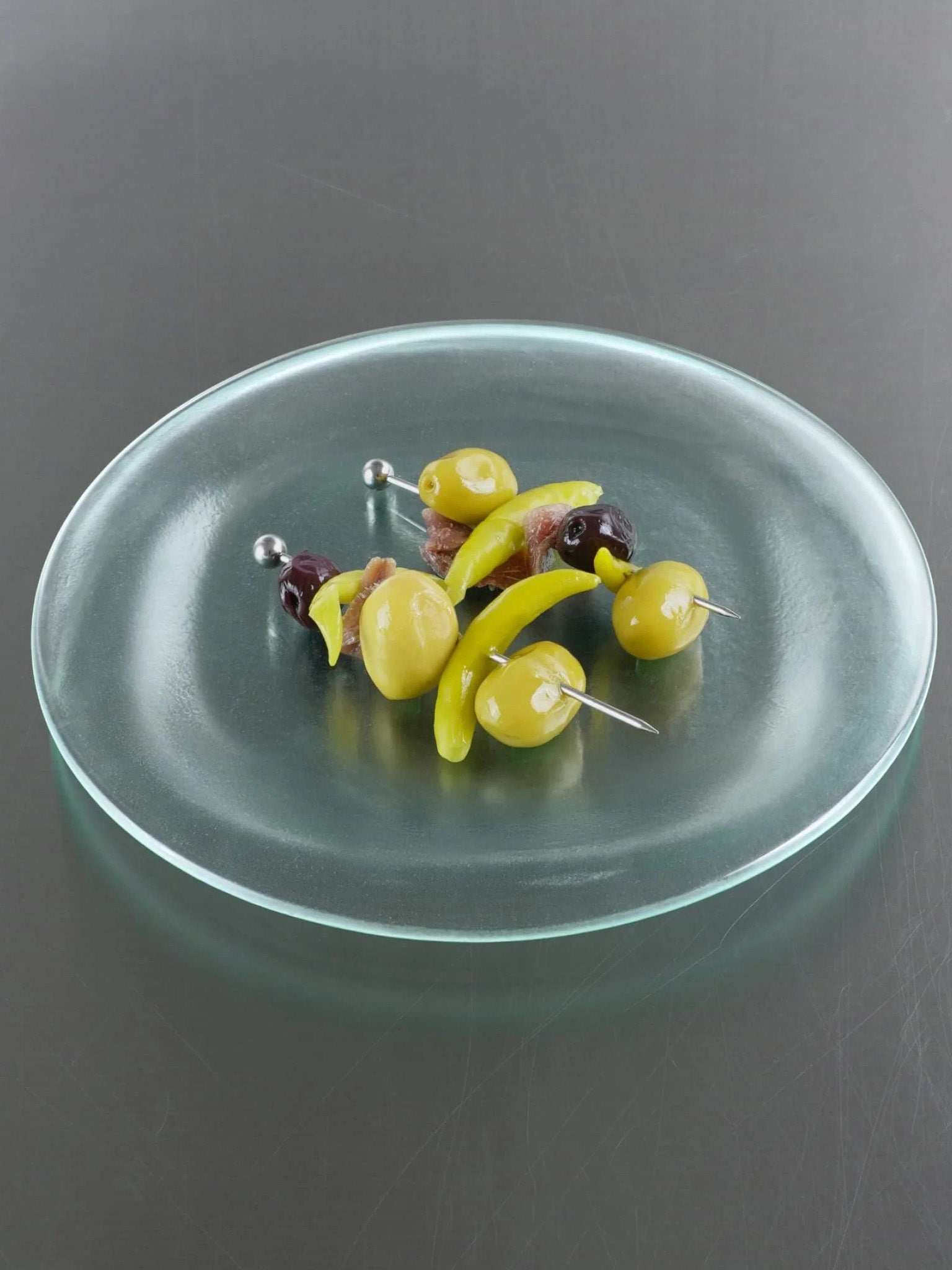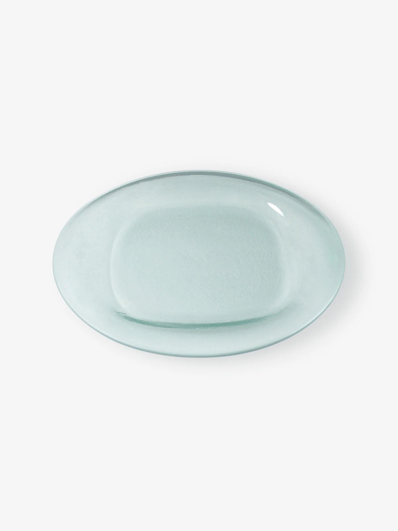 Glass plates for dining, snacking, and everything in between. Each plate is shaped from molten glass and finished with a wash of colour beneath, a vibrant base for whatever you're serving.
