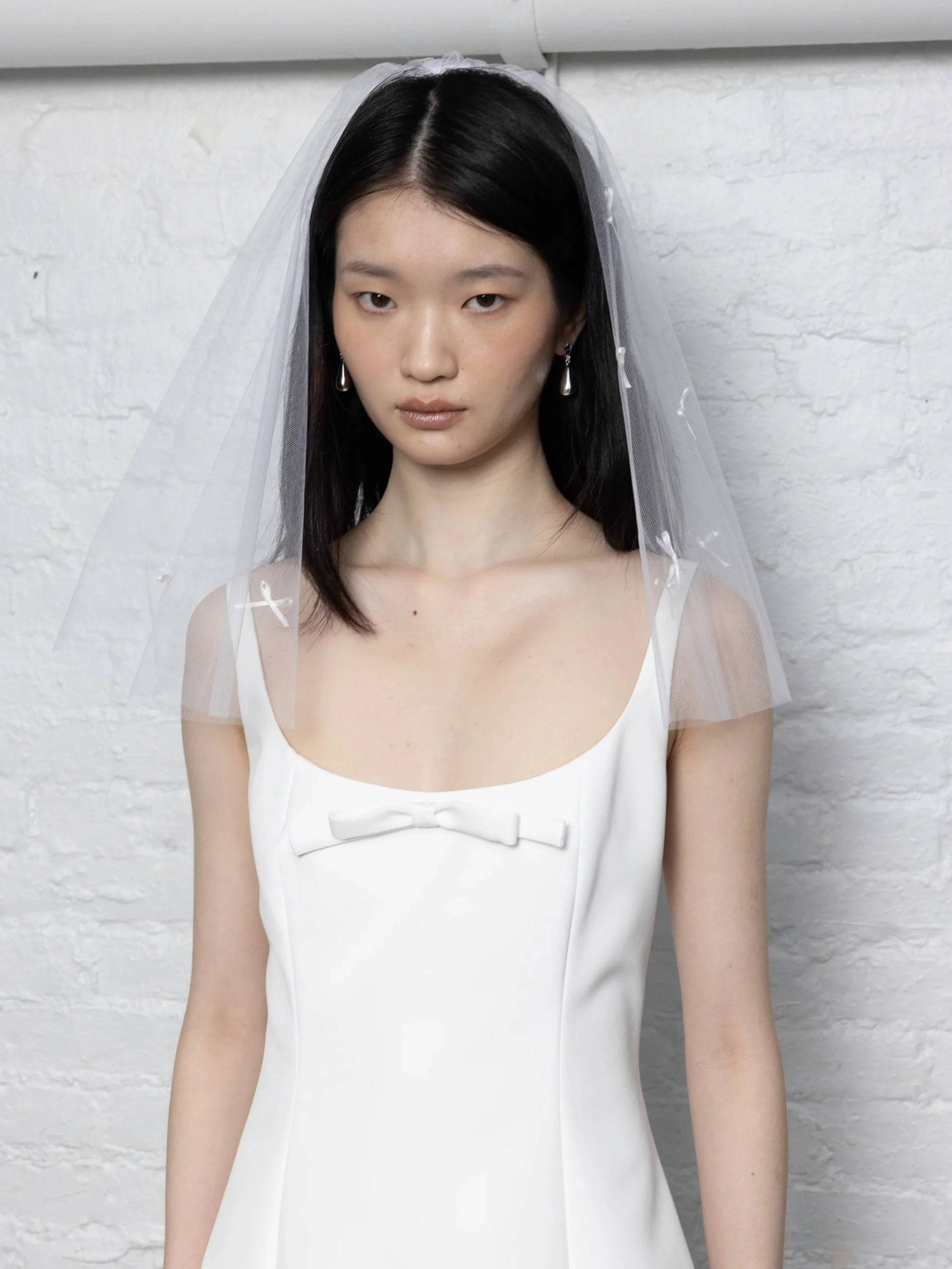 An ultra-flattering tailored mini dress made from crisp white suiting. With adjustable straps, a subtle scoop neckline with sweet bow detail and a concealed side zip closure.