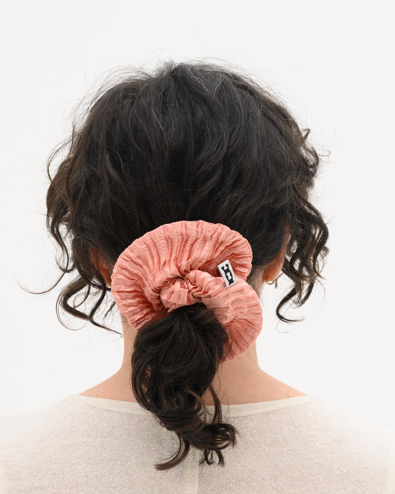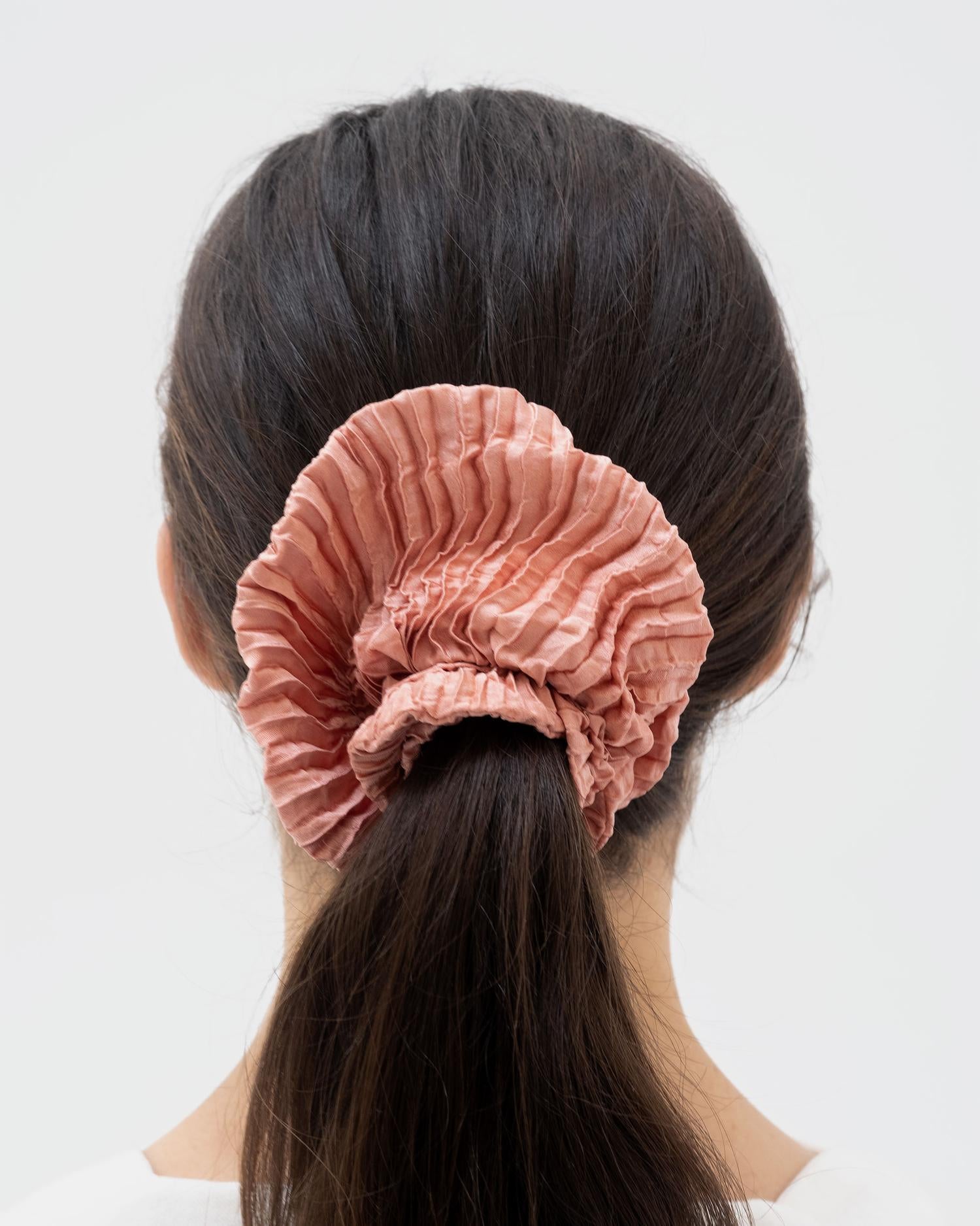 A plissé silk scrunchie with signature "A" label. Delicate hand pleated folds resemble the petals of a peony flower. The blush colour was achieved by dying with organic madder roots and oak gall.