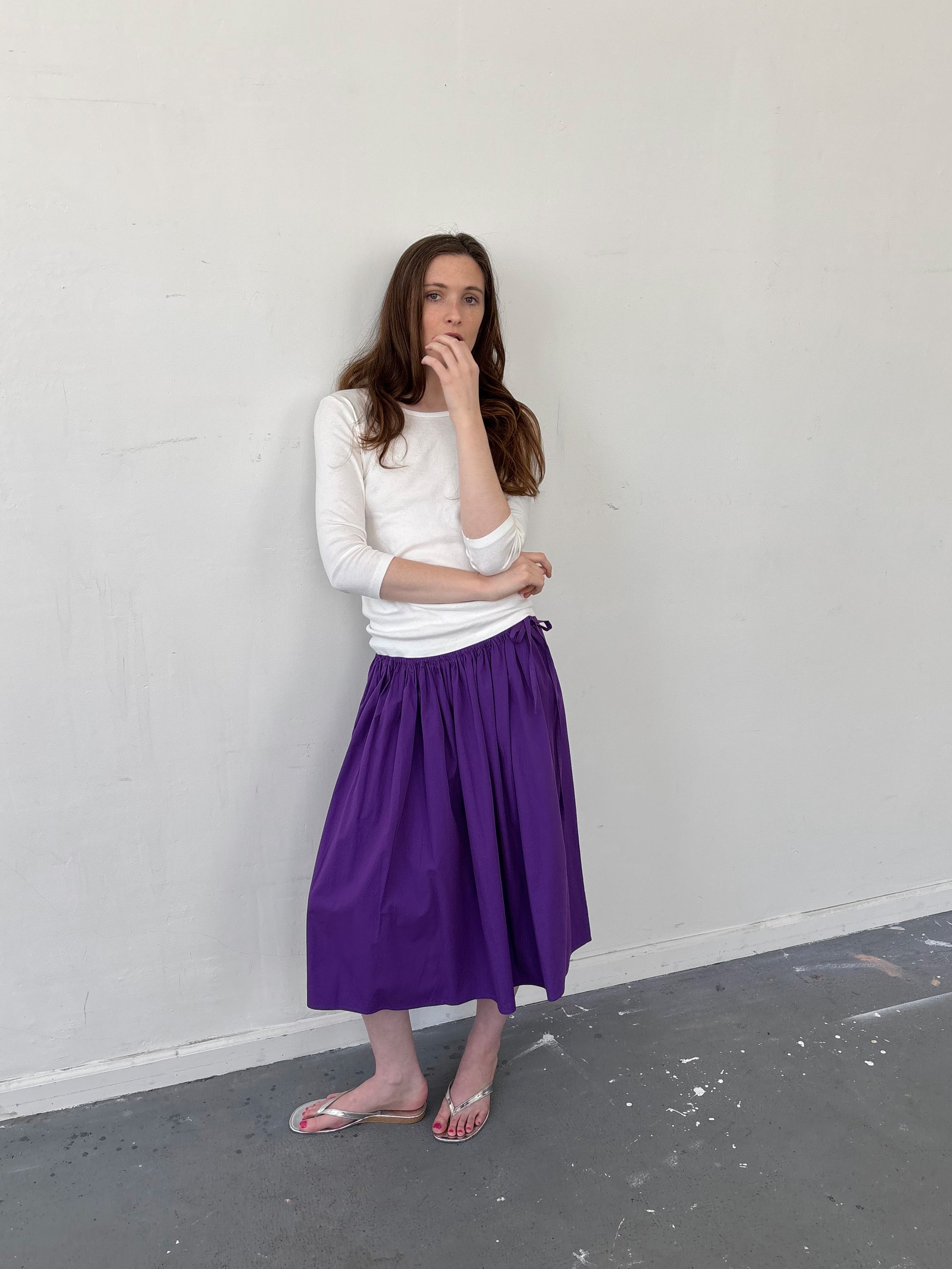 This 100% cotton poplin skirt cinches around the waist with an adjustable tie for a perfect fit. The gathered waist adds soft texture, while the mid-length offers effortless wearability.