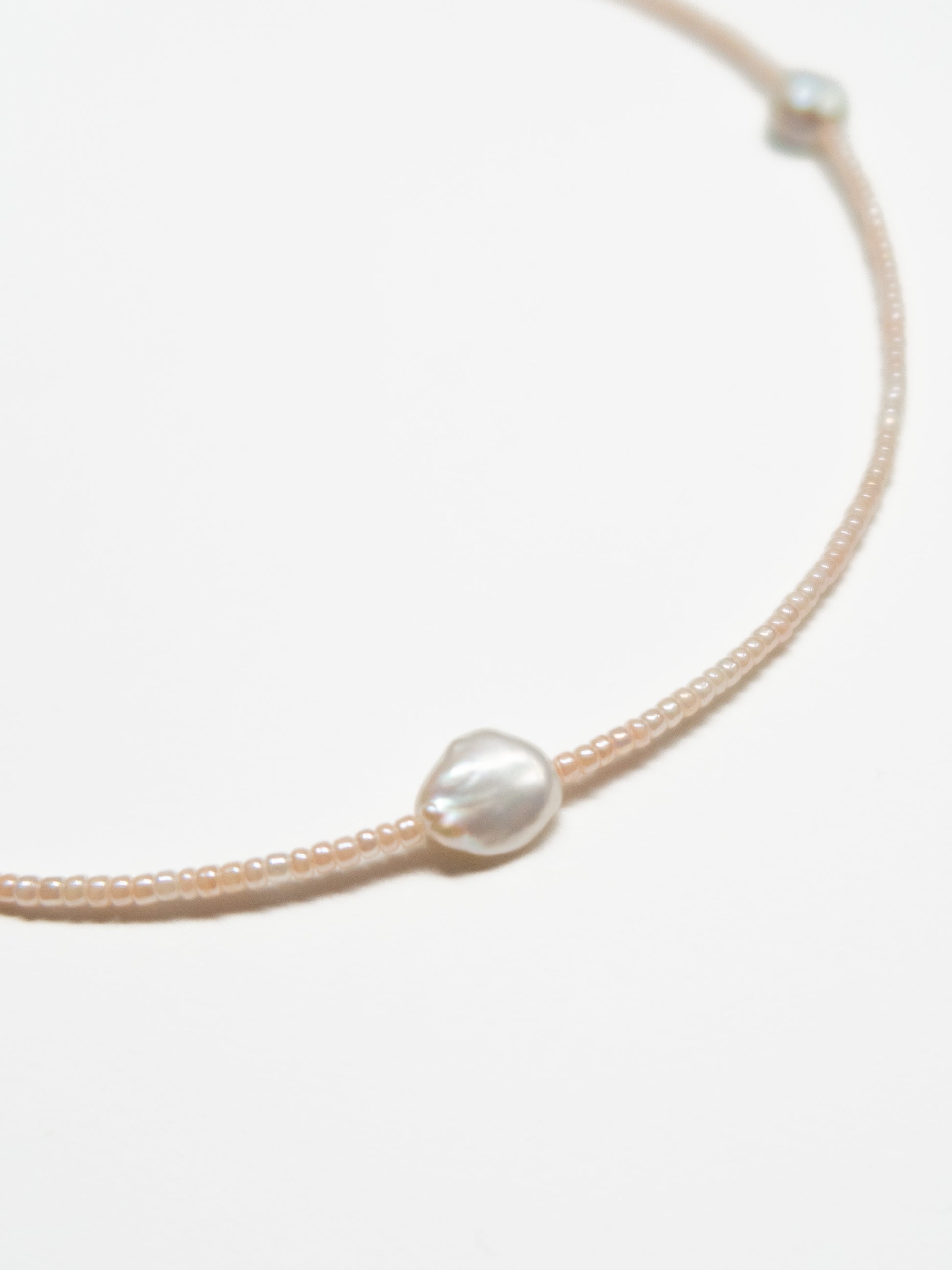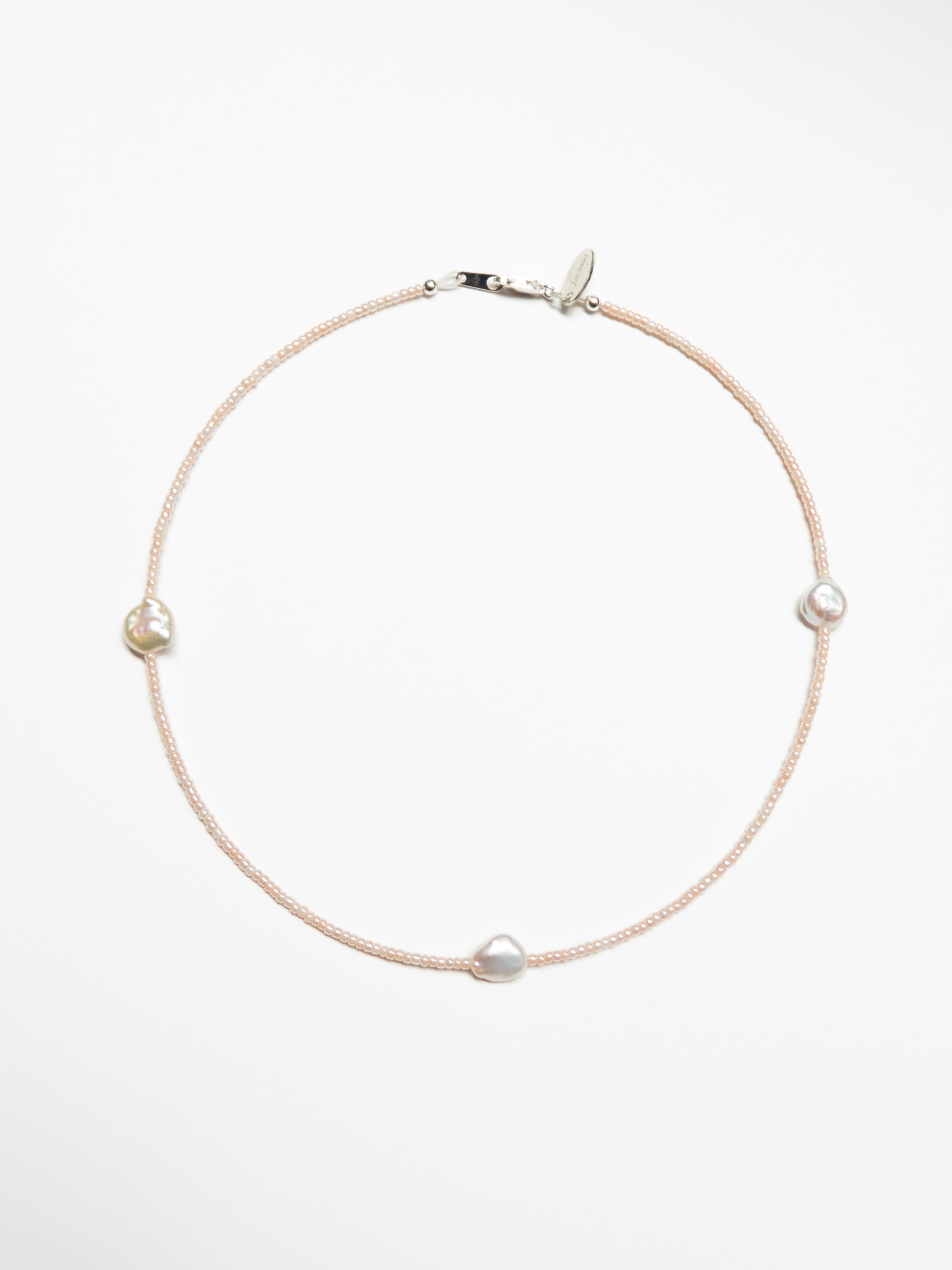 A delicate strand of peach Japanese glass beads with a trio of freshwater Keshi pearls. There's a sterling silver lobster clasp and petite Santangelo silver tag. No two pieces of jewellery are exactly alike as Santangelo uses natural elements in each piece.