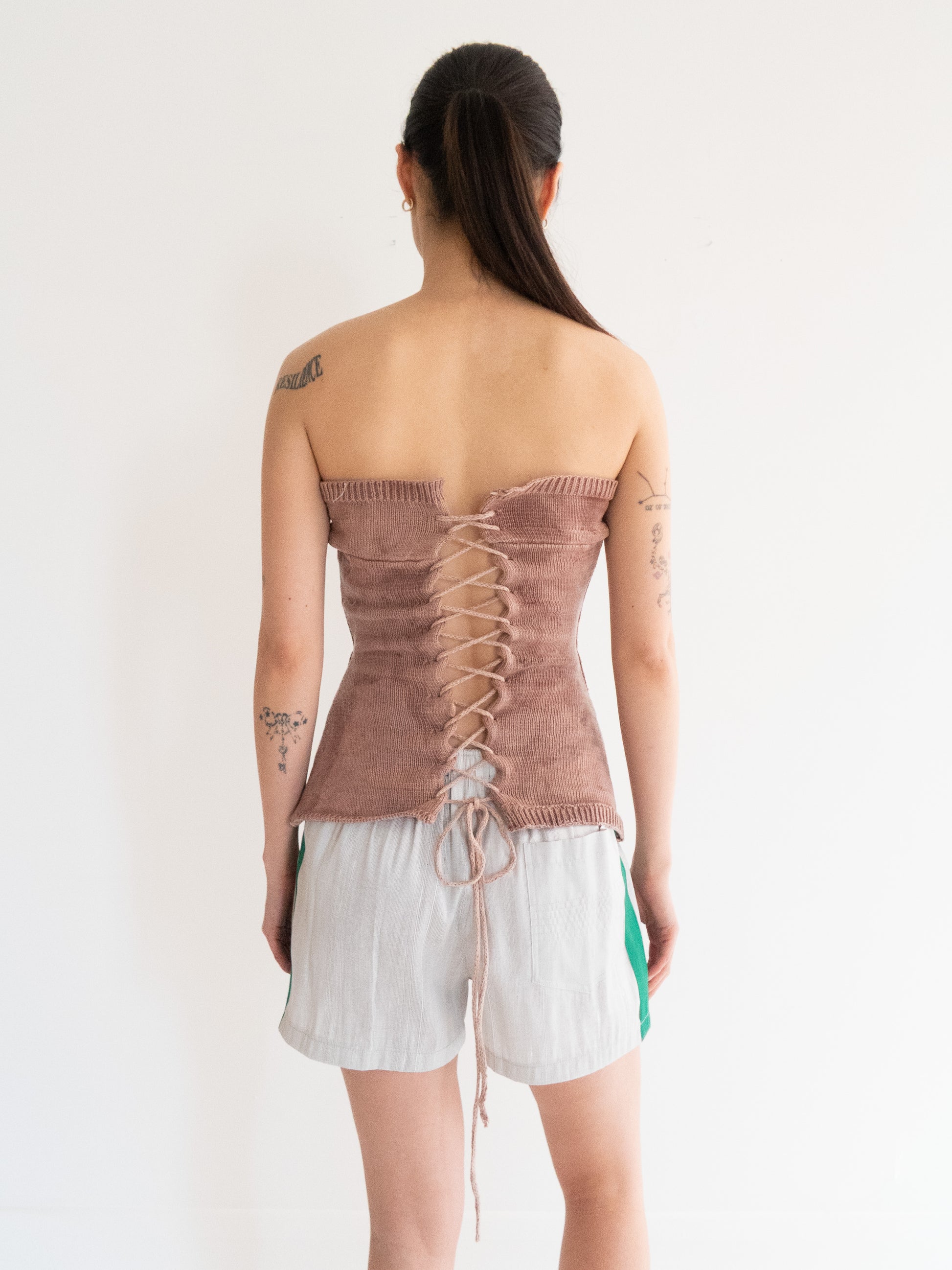 A sleeveless knit corset with a subtly three-dimensional bust and keyhole button detail, featuring open ladder panels at the sides. Handcrafted from 100% cotton with silk cocoon applique, each piece is painted in natural dyes, making every corset unique. Knitted panels conform to the body, and ties lace the back for an adjustable fit.