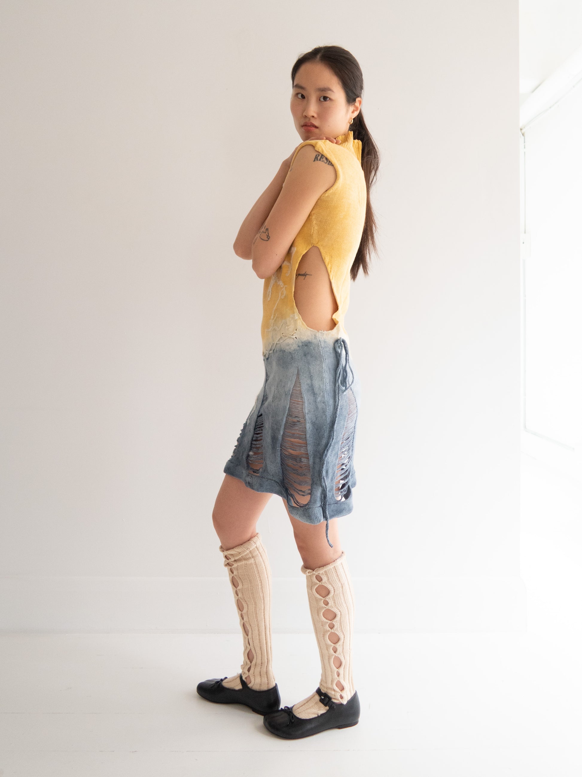 Tall, knee-length knitted socks in the natural hue of organic cotton, featuring lattice cut-out detailing along the sides. Each pair carries subtle variations in texture, celebrating the organic, handcrafted nature of their creation.