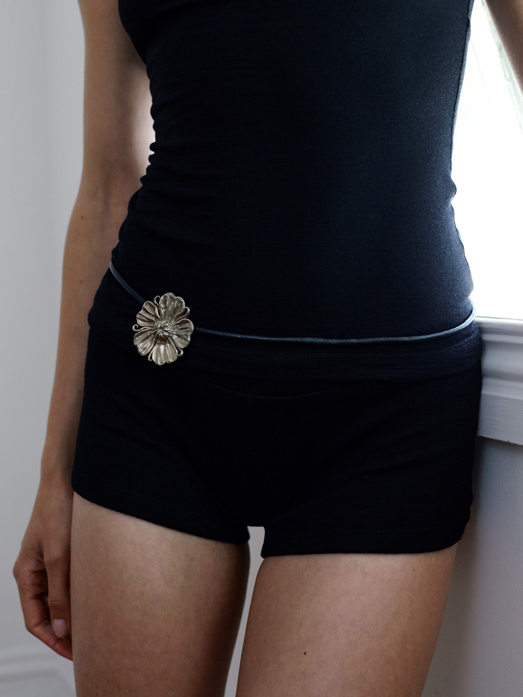 Decorative belt made from European leather featuring one White Bronze floral charm cast in the lost wax process. Real silver clasp to close. Created in collaboration with Phoebe Cutler.