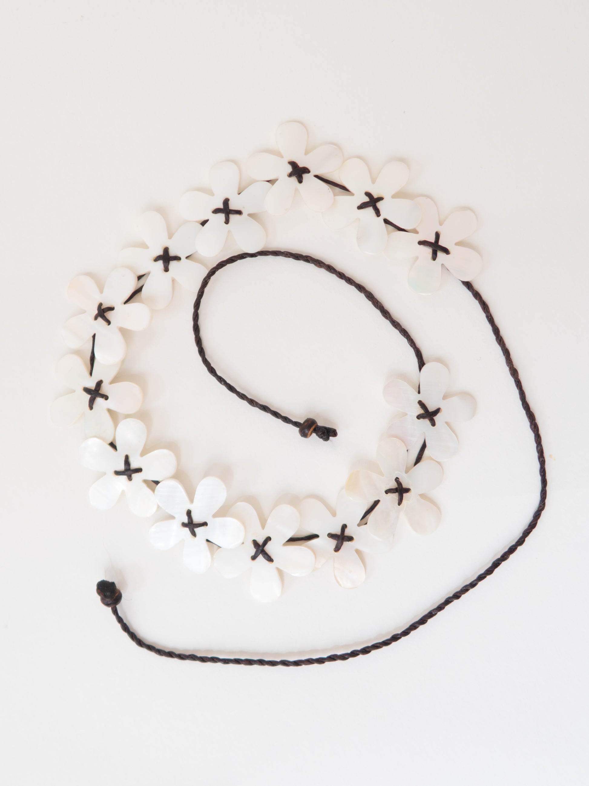 Hand-carved mother of pearl flowers from 1990s deadstock, strung on contrasting woven cotton cord with adjustable ties. The iridescent petals catch the light, whether worn as a choker or double-wrapped as a bracelet.
