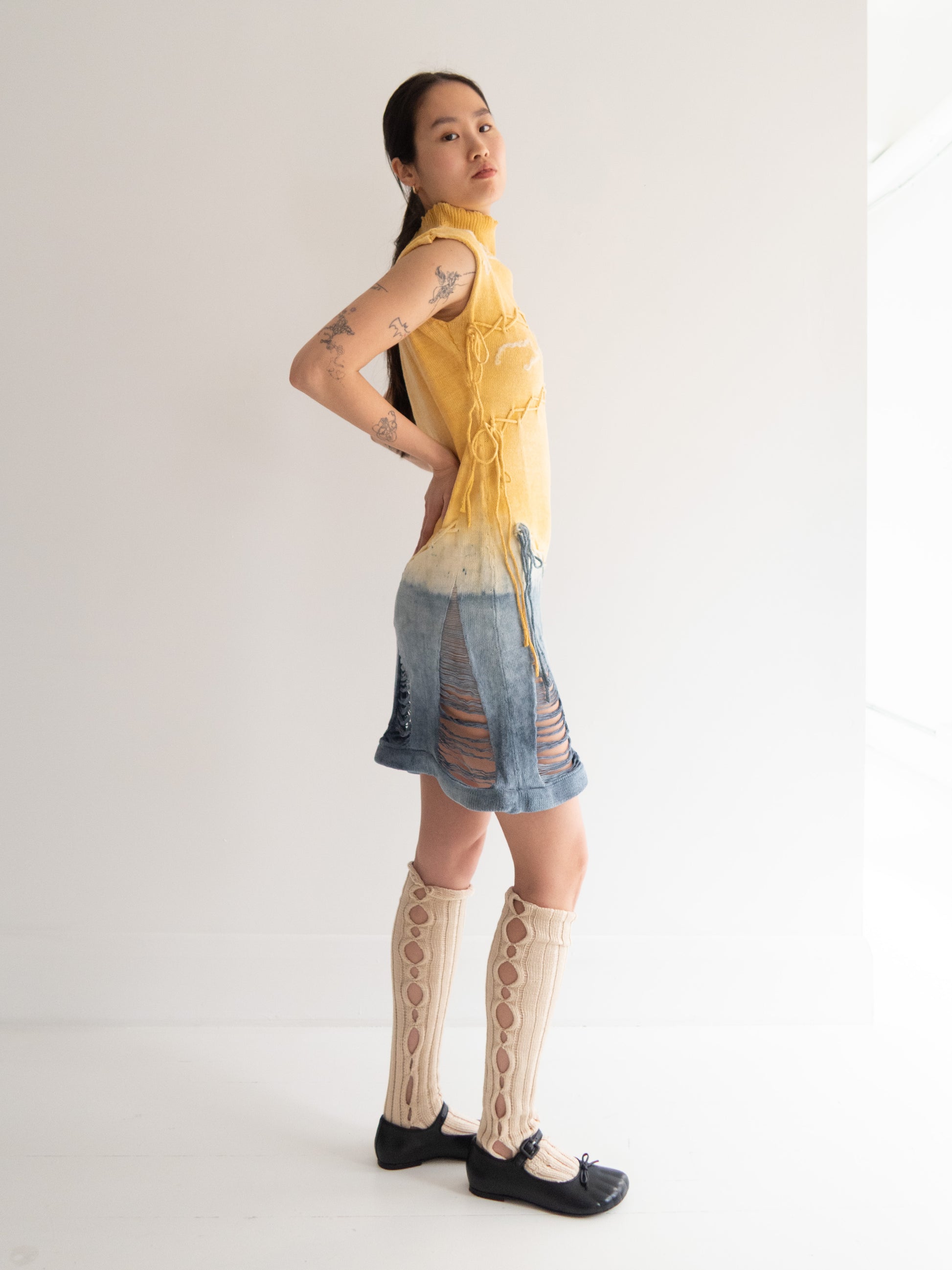 A sleeveless, high-neck knit mini dress featuring openwork ladder detailing and a lace-up feature across the chest that ties to the side. Handcrafted from 100% cotton and naturally dyed, each piece is unique, with variations in gradient and texture. Felted detailing forms distinctive lines and patterns, reflecting the studio's devotion to material integrity and sustainable craft.