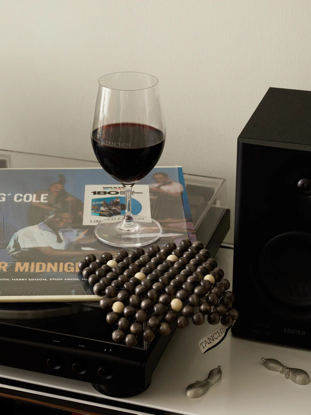 The Yin/Yang series is made from beads resembling Chinese medicinal grains and fruit and is also inspired by the beaded seat covers seen in many Southeast Asian taxicabs. Wooden beads are woven with nylon elastic yarn resulting in a tactile, sensorial and practical piece. Perfect for resting hot mugs or bowls on.